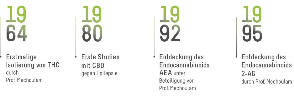 Als Wegbereiter der Cannabis-Forschung gilt Professor Raphael Mechoulam von der Hebrew University of Jerusalem. Anfang der 1960er-Jahre gelang es ihm als Erstem, die zentralen Cannabis-Wirkstoffe THC und CBD zu isolieren. 30 Jahre später war Mechoulam auch direkt an der Entdeckung des Endocannabinoidsystems beteiligt – eines Systems von Rezeptoren im menschlichen Körper, durch das die Cannabis-Wirkstoffe ihre Wirkung entfalten.